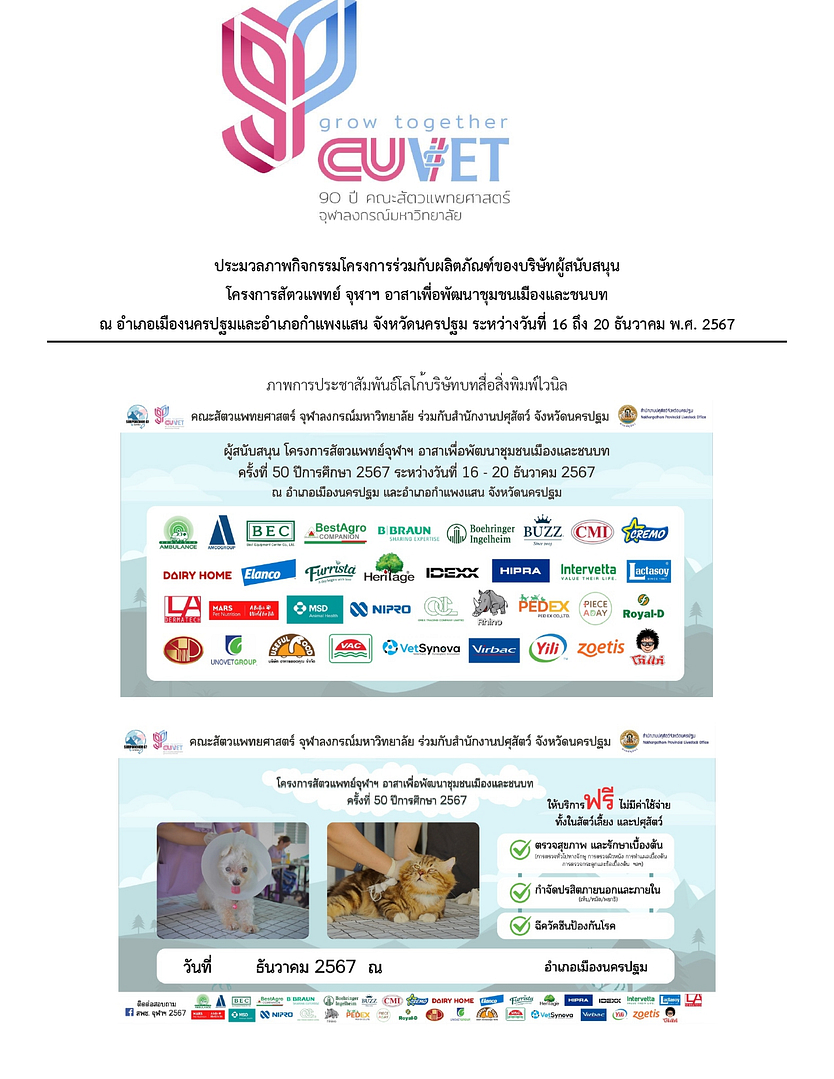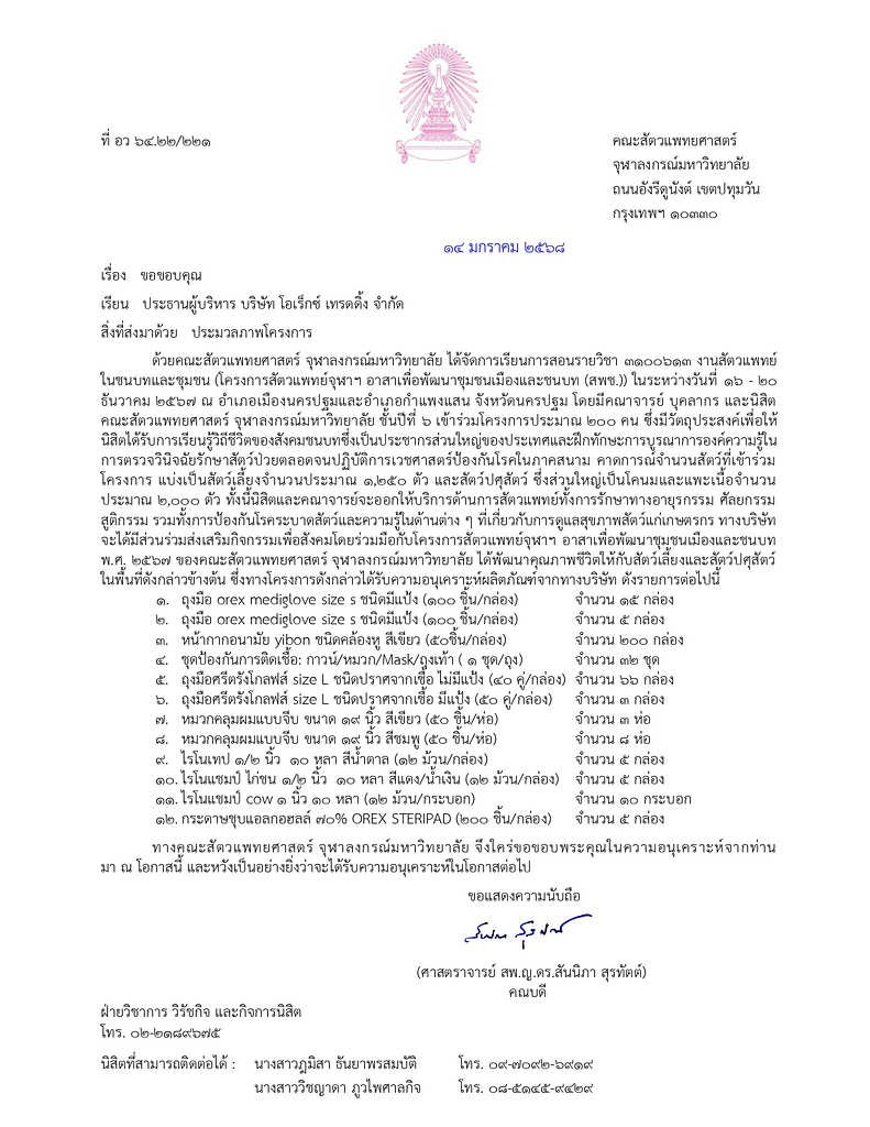 21 ม.ค. บริษัท โอเร็กซ์ เทรดดิ้ง ได้สนับสนุนอุปกรณ์ทางการแพทย์ ให้แก่ คณะสัตวแพทยศาสตร์ จุฬาลงกรณ์มหาวิทยาลัย